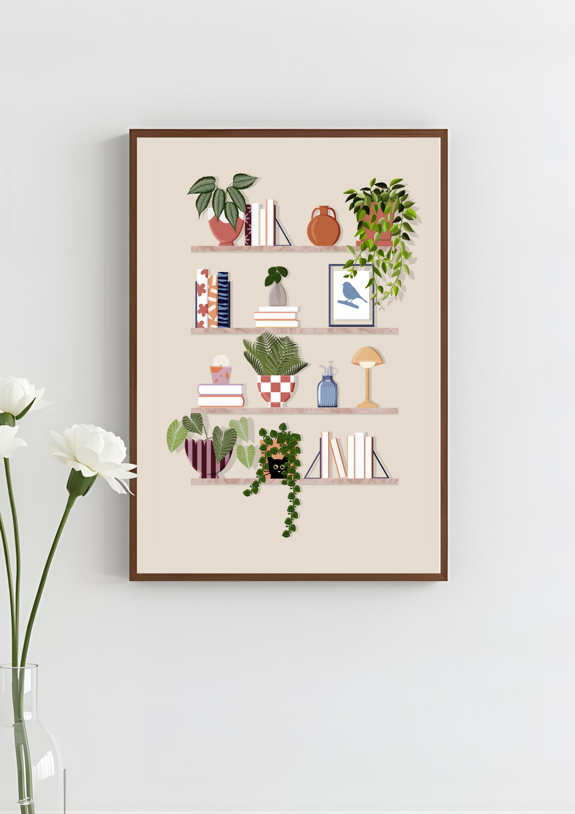 Experience the perfect blend of nature and literature with this meticulously designed art print. Showcasing an array of vibrant plants and charming plant pots, along with carefully curated props and homey decor on the shelves.